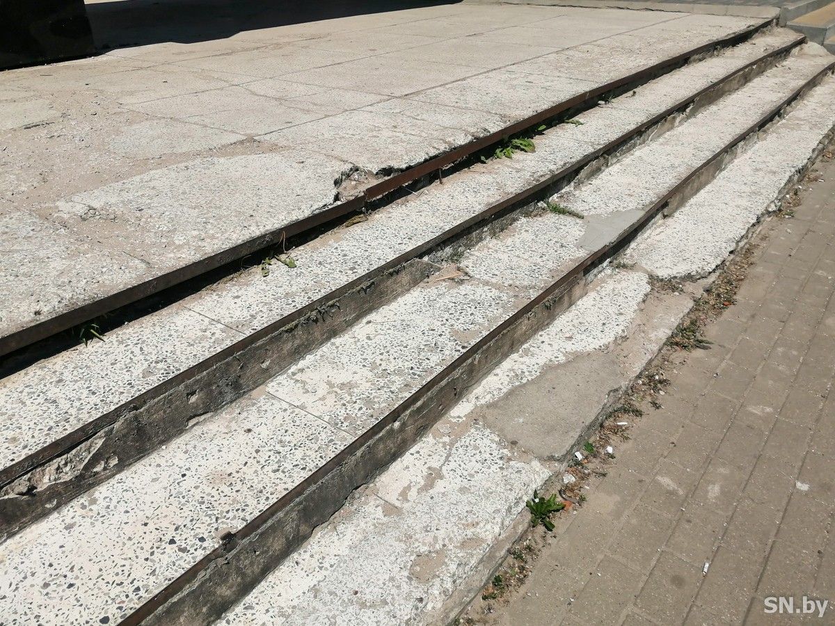 Центральную часть лестничного проема (самого видного, между прочим) «украшают» выщербленные ступеньки, в некоторых местах кое-как замазанные цементным раствором, а металлические укрепления уже поизносились, покоробились и норовят зацепиться за каблуки торопливых прохожих, среди которых немало детей. Отсюда и причины, которые приводят к падениям людей. Они очень комично смотрятся со стороны в каком-нибудь киносборнике, что обычно показывают перед сеансом основного фильма. Может быть, даже, к примеру, КУП «Гомелькиновидеопрокат» был бы рад запустить такой сборник в своей сети, чтобы зарядить бодростью зрителей. Но пусть бы он лучше отремонтировал ступени лестницы на территории у «Торгового центра», правообладателем которой является в настоящий момент. Благодарных людей в этом случае будет больше.