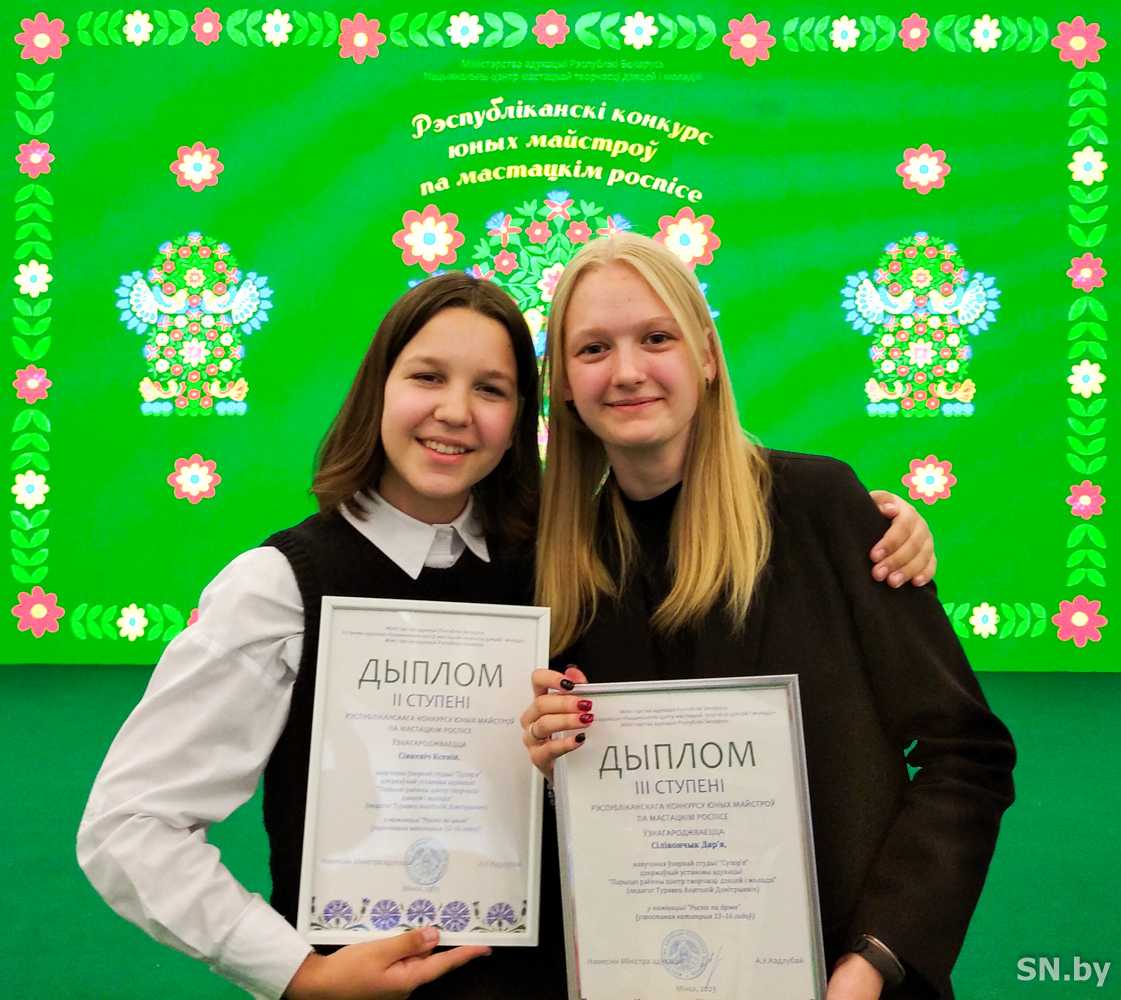 Кстати, два диплома достались Гомельской области, и оба заслужили юные художницы изостудии «Сузор’е» — Дарья Силивончик удостоена диплома 3 степени и Ксения Синкевич награждена диплом 2 степени. В студии девочки практикуют свои навыки и умения под чутким руководством Анатолия Дмитриевича. В качестве подарка мастерицам вручили наборы профессиональных художественных красок.