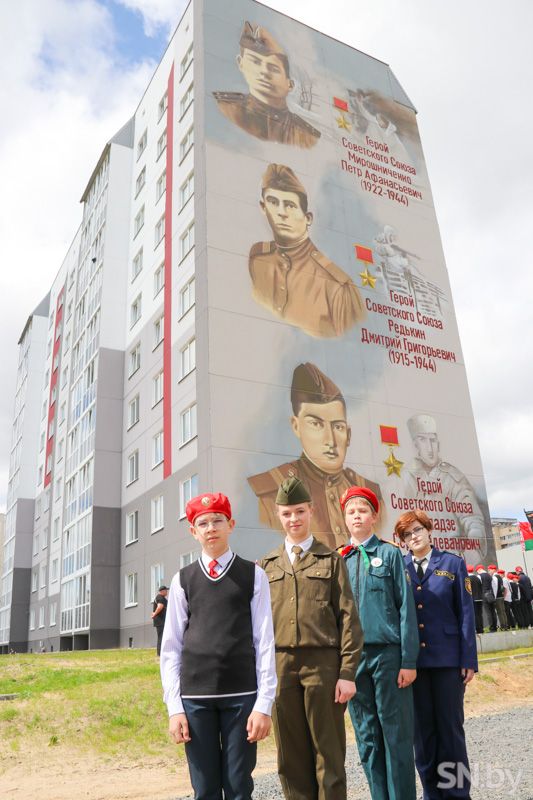 Патриотический мурал украсил дом №33 по ул.Пионерской и стал еще одной достопримечательностью нашего города. На нем изображены Герои Советского Союза Петр Мирошниченко, Дмитрий Редькин и Серго Чигладзе, погибшие на территории Светлогорского района. Герои, представленные на мурале, а это совсем молодые люди, - олицетворение яркой истории мужества и героизма, и заслуживают вечной памяти и благодарности потомков.