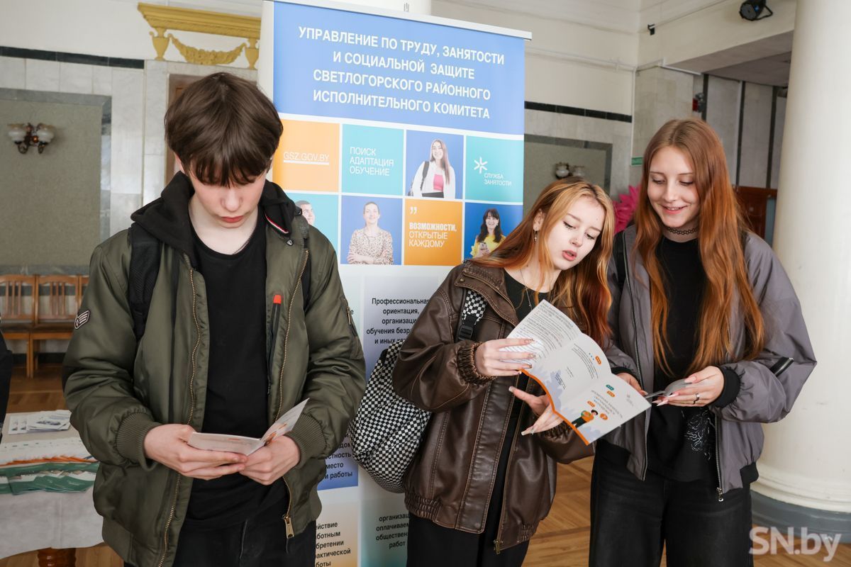 Трудоустроиться и заработать первые деньги юным светлогорцам предлагали представители кадровых служб ОАО «СветлогорскХимволокно», ОАО «Светлогорский ЦКК», Светлогорский филиал Гомельского облпотребобщества, Светлогорского лесхоза, Союза молодежи и многих других. Ребята времени зря не теряли: подходили к специалистам и интересовались буквально всем, начиная от вида предлагаемой занятости и условий работы до заработной платы. Отвечая на вопросы, начальник отдела кадров ОАО «СветлогорскХимволокно» Сергей Коваль рассказал, что их предприятие предлагает несовершеннолетним трудоустроиться уборщиками территорий. Заработную плату обещают хорошую. Также градообразующее предприятие готово обеспечить работой швей, укладчиков-упаковщиков, но только уже совершеннолетних.