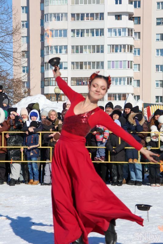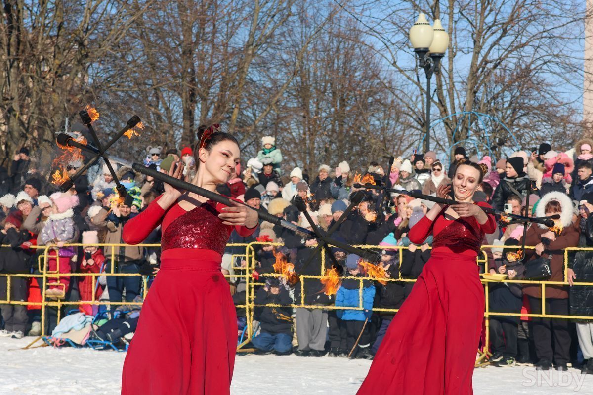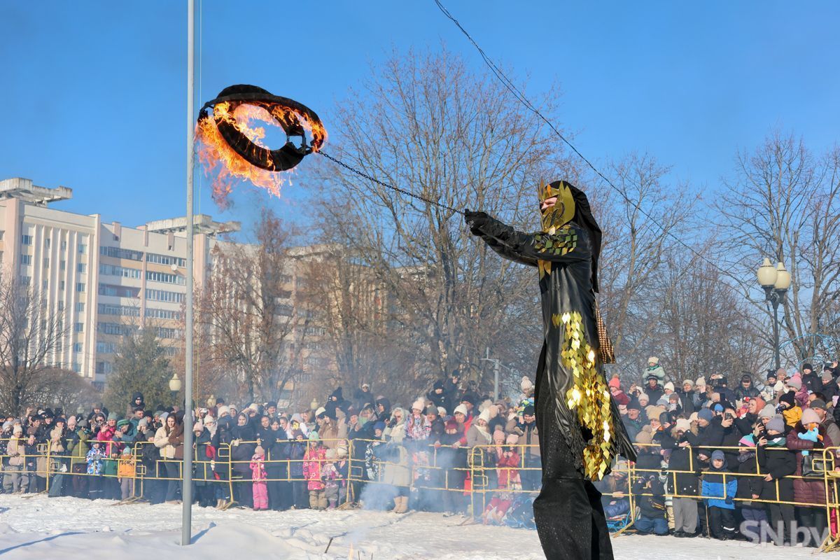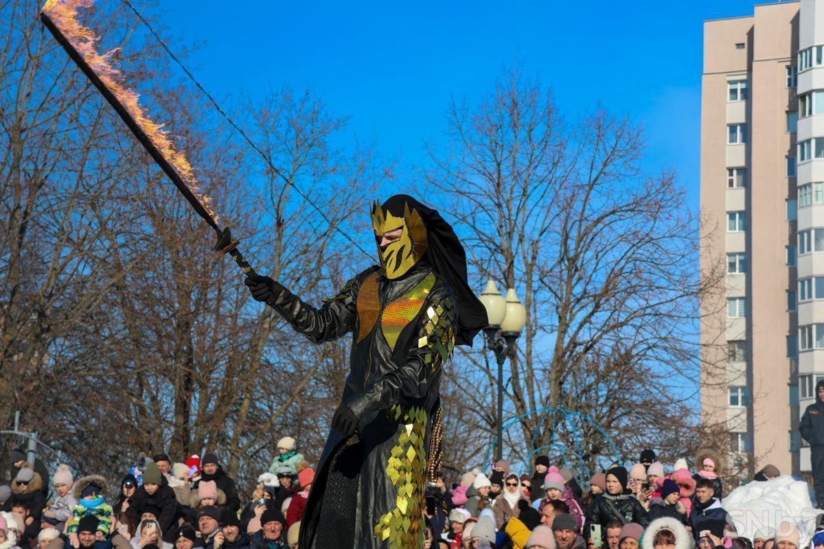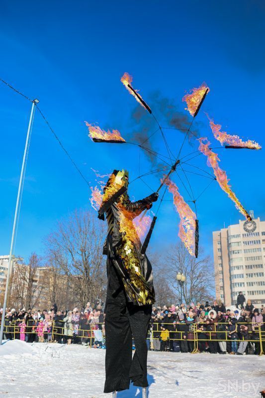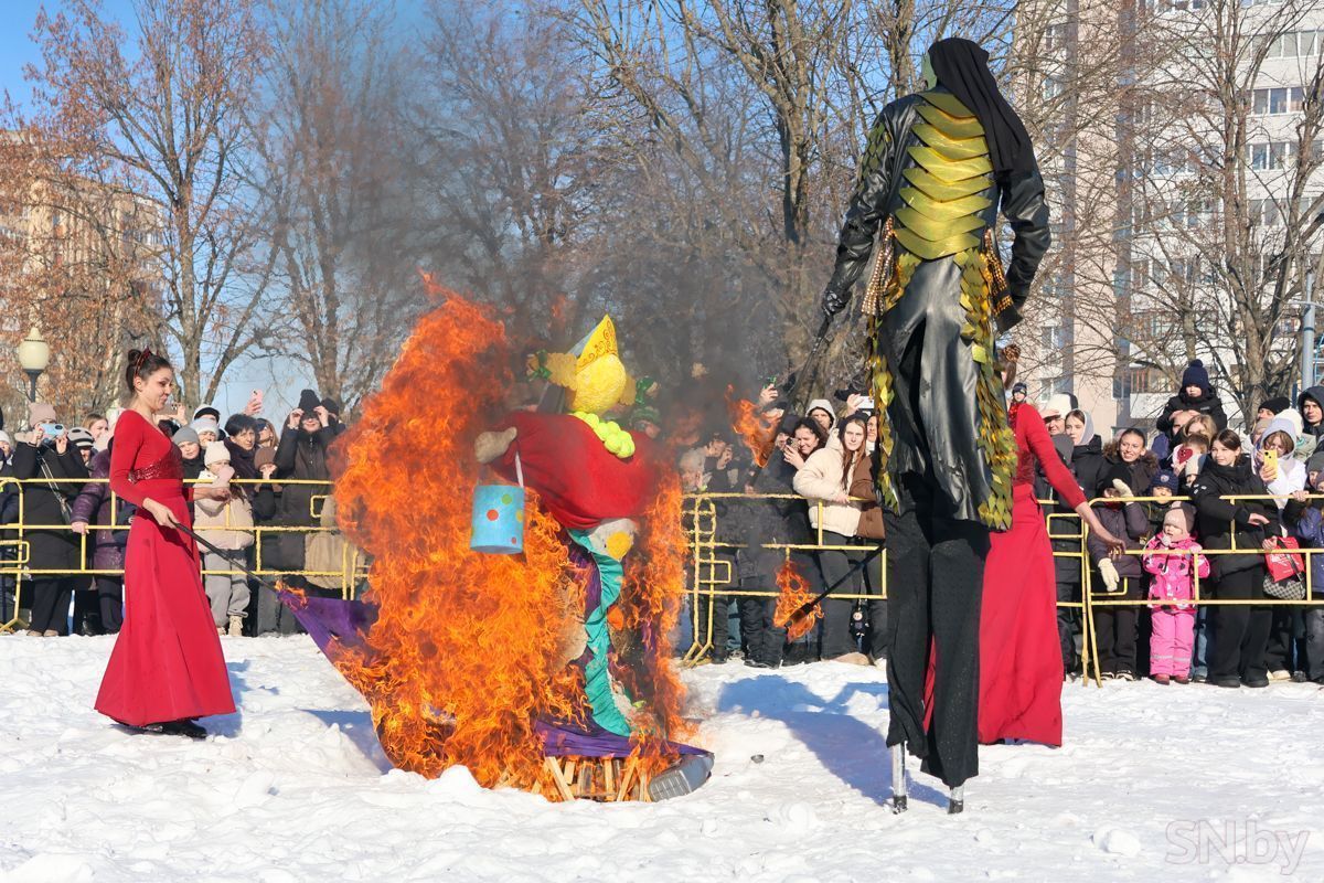 Кульминацией праздника Масленица стала традиция сжигания чучела зимы. Нарядную, но все-таки уже засидевшуюся в гостях зиму заставили вспыхнуть ярким пламенем гости из столицы, представившие зрителям красочное огненное шоу.