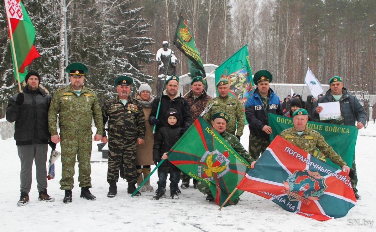 Посетители разошлись по локациям. Кто-то старался запечатлеть память о событии в фото, кто-то, возложив цветы к подножию стелы, просто молча стоял и смотрел на серый камень обелиска. Официальные делегации организаций со всего района передвигались во главе своих руководителей. Среди них выделялись организованные группы военных ветеранских организаций. Бывшие военные, которые, как они сами говорят, бывшими не бывают, соблюдая традиции своих родов войск, были одеты в свою оставшуюся после службы форменную одежду или в «гражданку», но выправка их выдавала. Некоторые обозначались еще и флагами. Среди национальных флагов Республики Беларусь и ведомственных стягов присутствовали флаги воздушно-десантных войск, военно-морского флота СССР и стилизованный флаг пограничных войск, тогда еще в советские времена КГБ СССР, а теперь Белорусского союза ветеранов пограничной службы. Парней в зеленых фуражках представляли на траурном мероприятии ветераны-пограничники из Бобруйска.