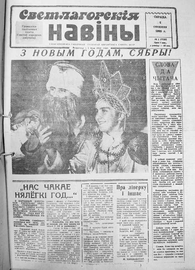 – В 1991 году мы с Людмилой были Дедом Морозом и Снегурочкой на школьной елке в СШ №1, где учились. Наш одноклассник Александр Титорович работал внештатным фотографом районной газеты. Саша увлекался фотографией, у него был хороший фотоаппарат «Киев-4В». Не помню нюансов и потому не скажу, было ли это редакционным заданием. Возможно, в редакции его просили сделать какие-то варианты фото, чтобы потом можно было их разместить в газете. Людмила – красивая девушка славянского типажа, а в этом кокошнике она очень хорошо смотрелась, поэтому, возможно, фотография и понравилась. Таким образом мы попали на первую страницу. Кстати, мы два раза были на первой полосе – в 1991 и 1992 годах. Как это получилось? Не знаю.