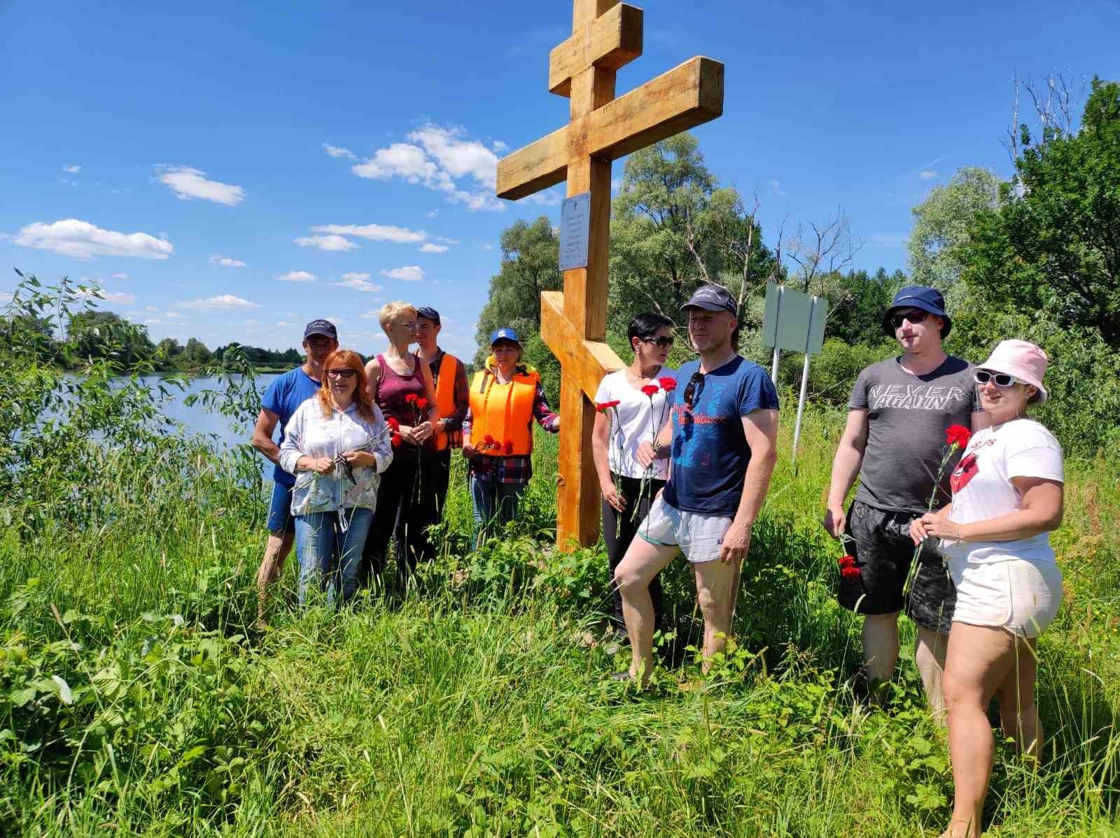 Затем активисты погрузились в байдарки, и началось увлекательное путешествие по быстроходной Березине, которое заняло порядка трех с половиной часов. Прекрасная погода, свежий ветерок, водная стихия, неповторимо красивая природа нашего края способствовали высокому градусу драйва участников. От верховья к устью реки в Березину впадает речушка Ола, давшая название деревни. В этом месте совсем недавно был установлен Поклонный крест в память о трагической судьбе жителей деревни Ола, погибших от рук фашистских оккупантов в годы Великой Отечественной войны. Здесь участники регаты высадились на берег и возложили цветы к монументу. Сколько бы лет не минуло с тех пор, страшная трагедия навсегда останется в памяти и сердцах потомков. Особенно важно знать историю своей малой родины современному поколению, которое выросло под мирным небом и не имело возможности общаться с очевидцами и участниками войны. В Год исторической памяти важно приобщать молодежь к истории своего народа, а для этого – посетить каждое братское и воинское захоронение, чтобы передать через поколения память о доблестных предках и не допустить повторения войны на нашей земле.