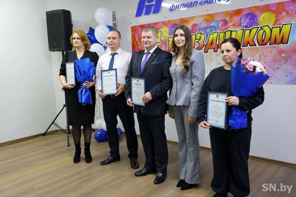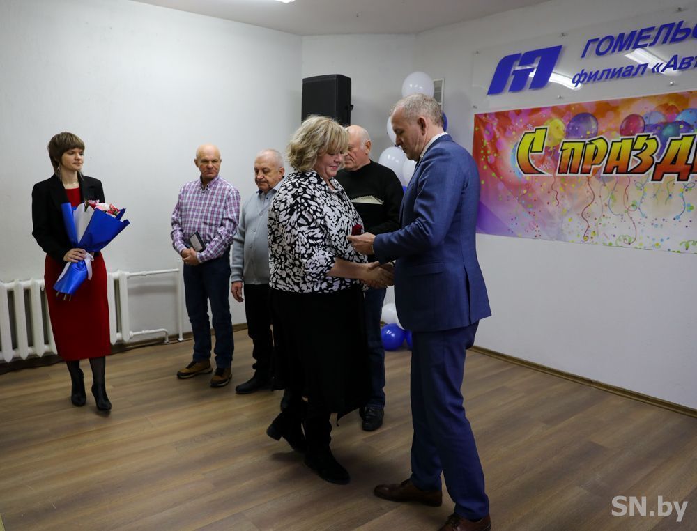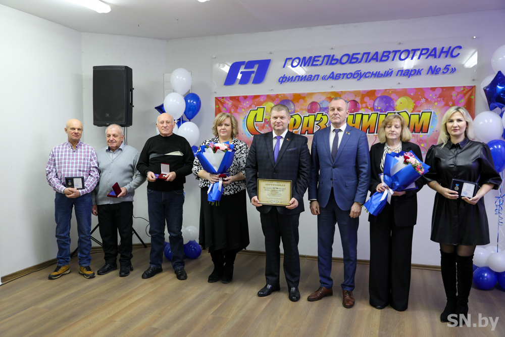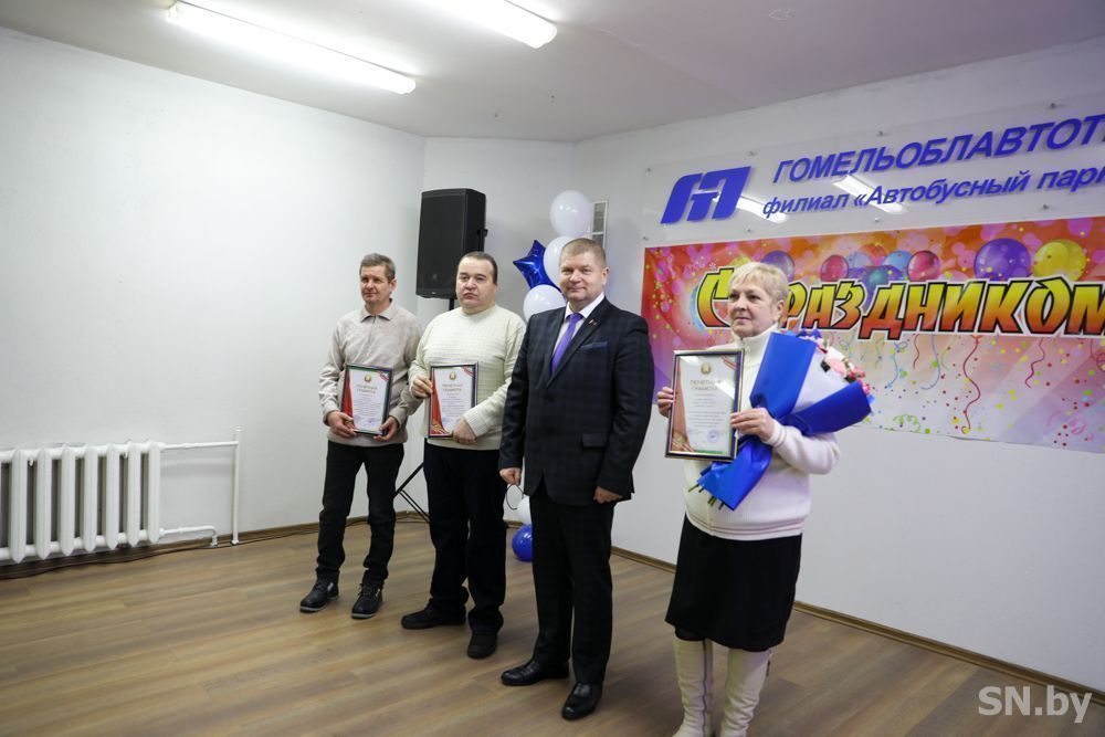 С юбилеем коллег поздравил генеральный директор ОАО «Гомельоблавтотранс» Дмитрий Старостенко. Он вручил медали «Почетный работник Гомельоблавтотранс» водителям автомобиля Валерию Гребенку и Владимиру Максименко, а также юбилейную медаль «80 лет Гомельоблавтотранс» – водителю автомобиля Вячеславу Вешнякову и слесарю-электрику по ремонту электрооборудования Виктору Бубалькевичу, серебряный нагрудный значок с логотипом ОАО «Гомельоблавтотранс» – старшему диспетчеру Анне Евдаш, Почетную грамоту «Гомельоблавтотранс – бухгалтеру 1-й категории Елене Тозик. Трудовой коллектив автобусного парка отмечен генеральным директором сертификатом на сумму 18 700 рублей.