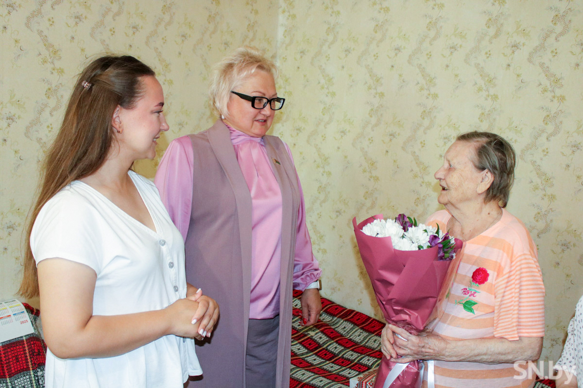 В День освобождения Беларуси от немецко-фашистских захватчиков председатель Светлогорского районного Совета депутатов, глава районного отделения Белорусской партии «Белая Русь» Людмила Величко, начальник управления по труду, занятости и соцзащите райисполкома Наталия Зобова и первый секретарь РК ОО «БРСМ» Яна Нициевская поздравили с праздником труженицу тыла Валентину Мухину.