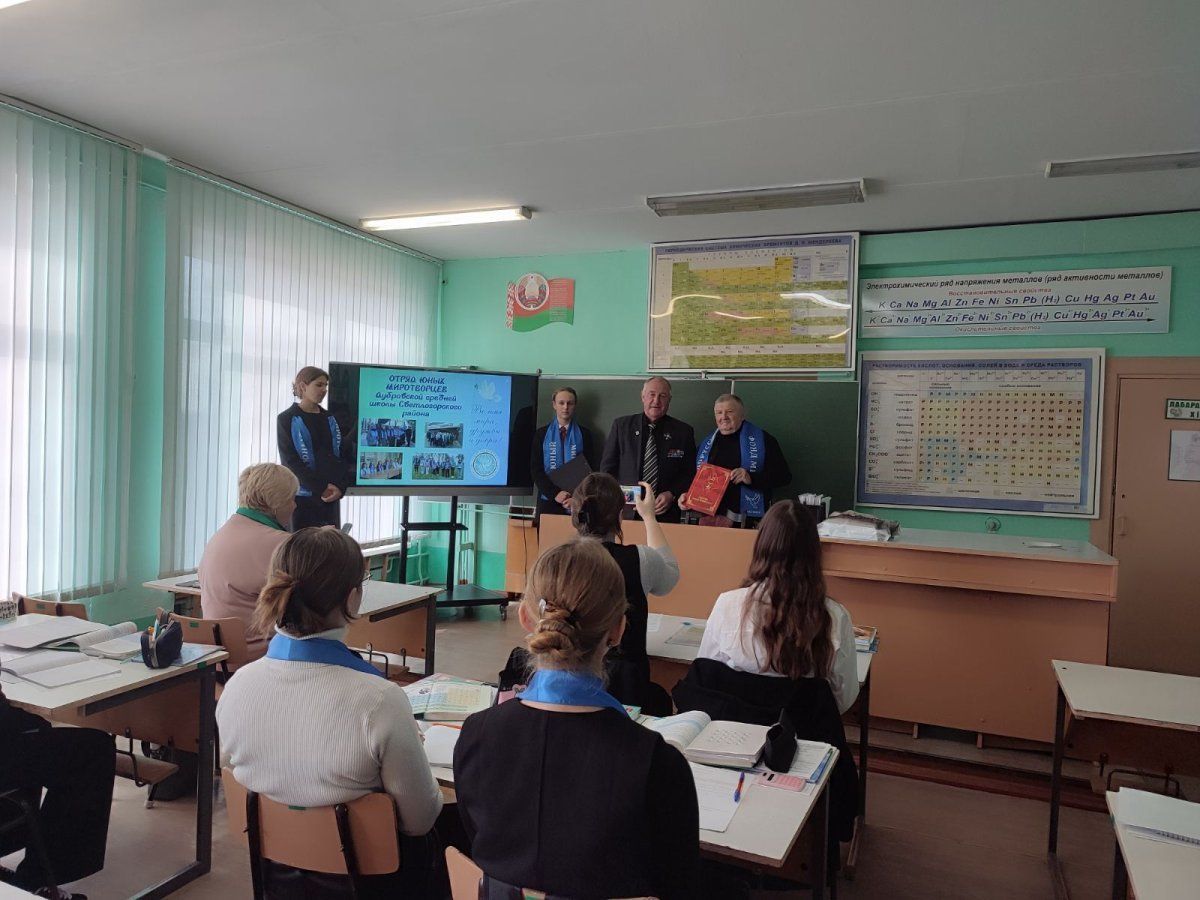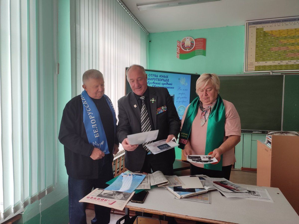 Гостей познакомили с деятельностью отряда юных миротворцев. Члены отряда занимают активную гражданскую позицию, успешно реализуют себя в социально значимых делах: помогают ветеранам и детям войны, одиноким людям, участвуют в благоустройстве памятников и воинских захоронений. Ребята рассказали о наиболее значимых инициативах и поделились планами – проведение патриотических акций, акций по здоровому образу жизни, мероприятий по наведению порядка на территории сельсовета и местах захоронений героев Великой Отечественной войны, дальнейшая работа ветеранами.