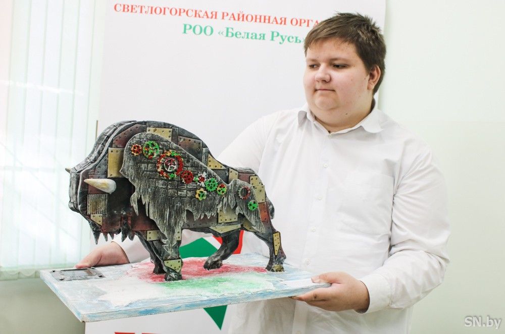 Виктор Бородин 6 лет занимается в кружке по выпиливанию в Светлогорском центре технического творчества детей и молодежи. В этом году талантливый парень принял участие в конкурсе «Символы моей страны», проводимом республиканским общественным объединением «Белая Русь». Решение, какую работу представить на конкурс, было принято совместно с педагогом Центра и мамой в одном лице Ириной Бородиной: именно с величественным зубром у многих ассоциируется наша сильная и процветающая Беларусь.