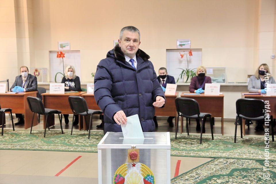Губернатор опустил бюллетень в урну для голосования участке №18 Центрального района Гомеля, расположенном во втором корпусе ГГУ имени Ф. Скорины.
