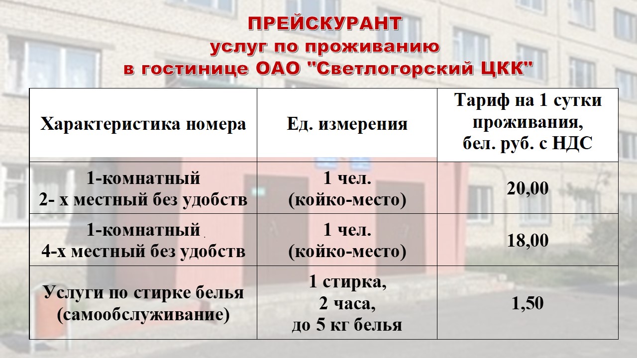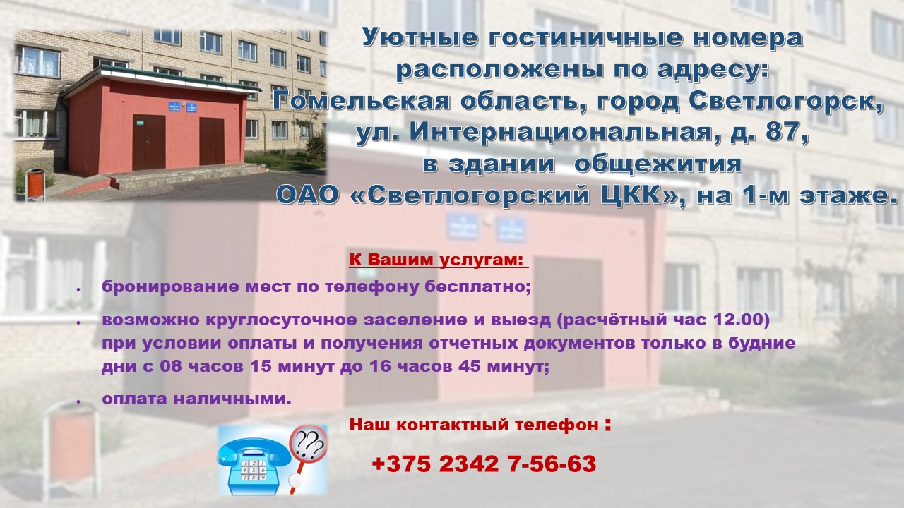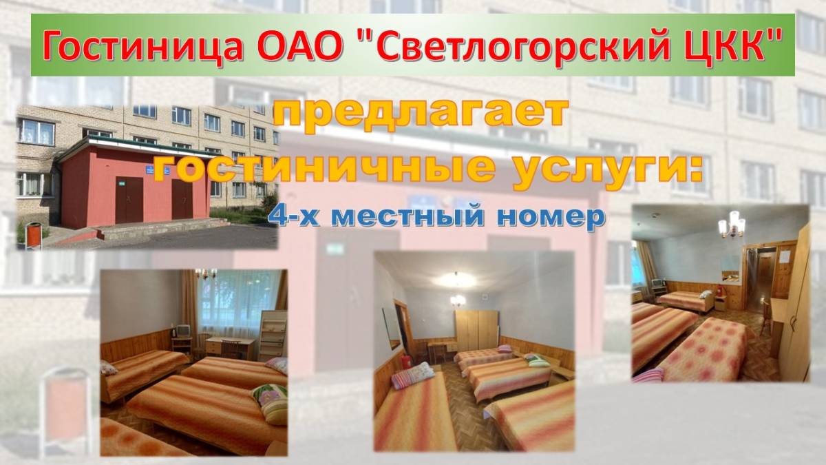 Гостиница ОАО «Светлогорский ЦКК» расположена в здании общежития по адресу: г.Светлогорск, ул. Интернациональная, 87, тел. 802342 75663.