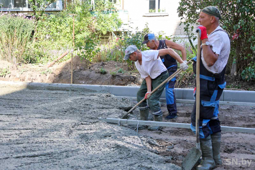 Продолжается работа по устройству бетонной дороги на подъезде к ДС №11. Работники коммунальной службы организованно выполняют работы по устройству бетонного покрытия, укладывая его под определенным уклоном по строго отмеченным вешкам.