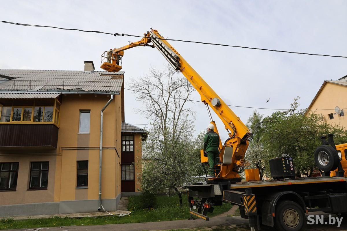 Ветер повалил много деревьев. Рабочие КЖУП «Светочь» сейчас режут упавшие деревья, активно работает транспорт по вывозу упавших веток. По улице Интернациональной, 9, где дерево упало на машину, его раскряжевали еще вчера. Все силы КЖУП «Светочь» брошены на устранение последствий вчерашней погодной аномалии.
