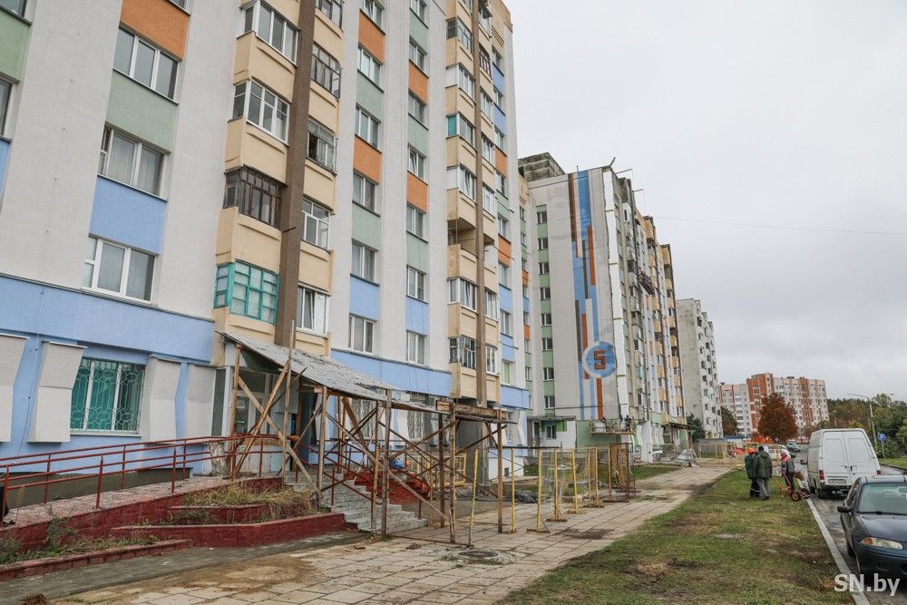 На фото: дорожные рабочие — братья Владимир и Сергей Амельчени — вместе с Геннадием Попковым демонтируют поврежденное крыльцо возле подъезда для дальнейшей реконструкции; штукатур Андрей Янченко наносит на фасад дома штукатурную сетку.