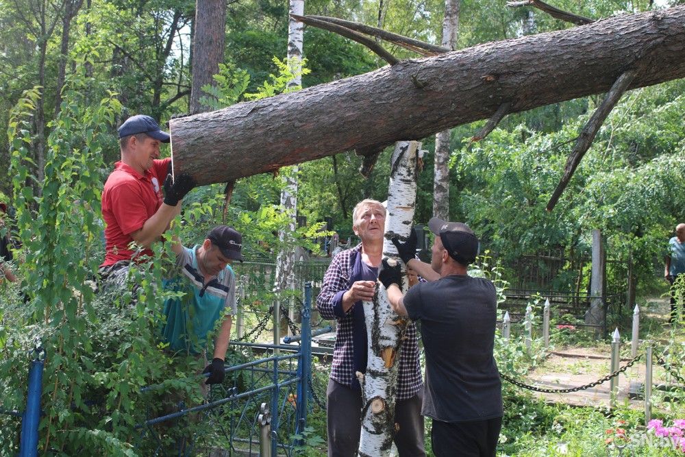 Работы по наведению порядка на городском кладбище по ул.Лазо продолжаются. Как отмечает начальник участка ритуальных услуг КЖУП «Светочь» Светлана Колдуненко, «фронт восстановительных работ на кладбище большой. Некоторые деревья накрыли одновременно несколько могил. Чтобы их убрать, надо высчитать до сантиметра, где делать каждый распил, где «страховать» ствол и где его еще придерживать. Работа эта очень сложная и скрупулезная».