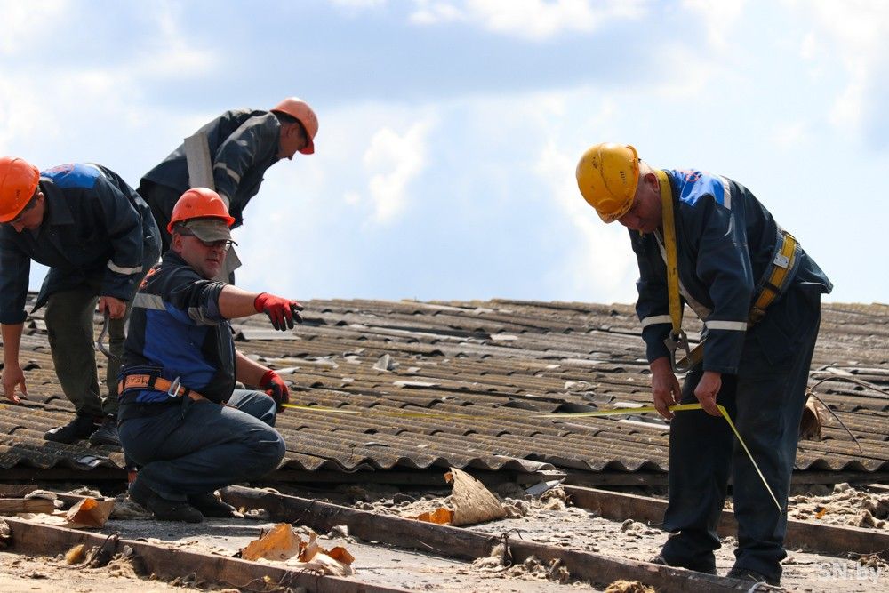 Бригада работников ОАО «Светлогорский ЦКК» работает на объекте в Пожихаре больше недели. Они снимают поврежденный шифер и попутно убирают ветхие элементы деревянных конструкций стропильной системы, чтобы создать прочный и долговечный каркас крыши.