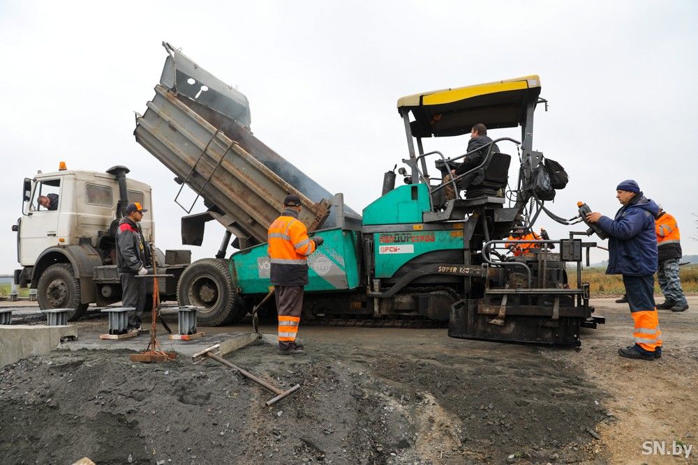 Вскоре появляется первый самосвал. Завод заработал, и свежий дымящийся асфальт пересыпается в бункер асфальтоукладчика. Кругом все зашевелилось, зарычали двигатели, люди разбежались по рабочим местам – кто за руль спецтехники, кто к асфальтоукладчику.