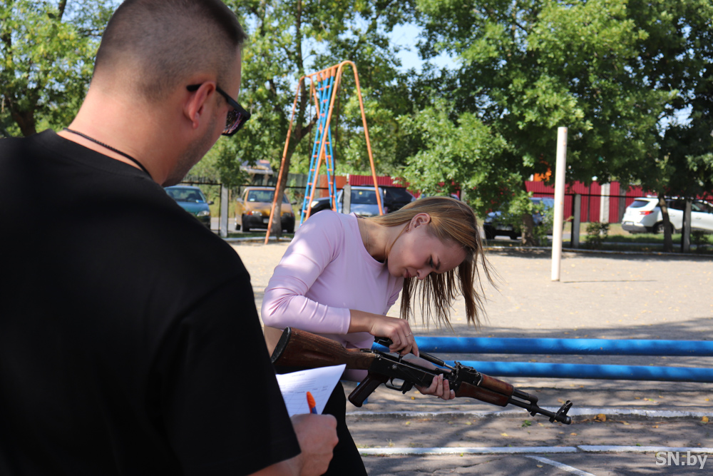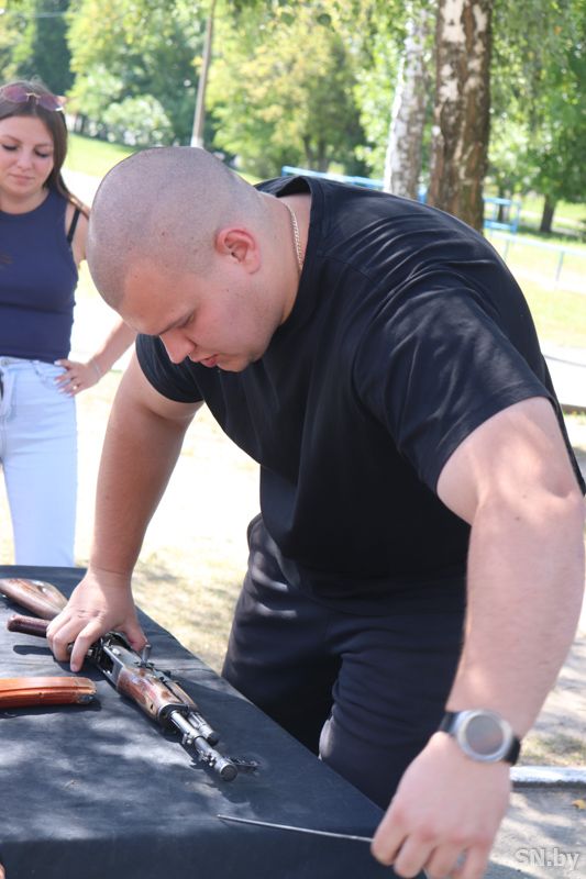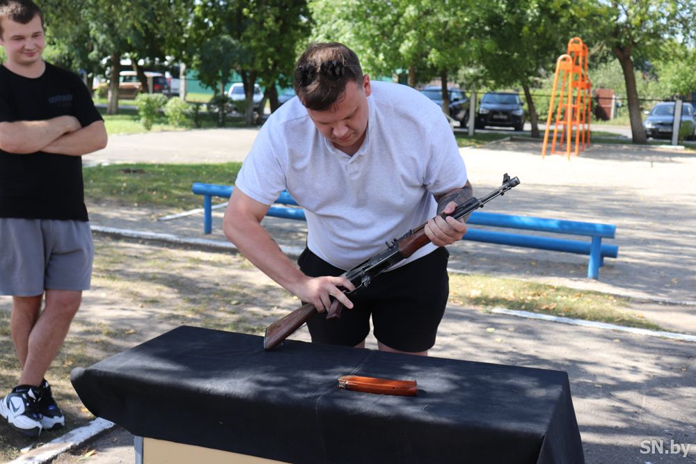 Работающая молодежь трех трудовых коллективов – ОАО «СЦКК», ОАО «СветлогорскХимволокно» и команда отдела образования Светлогорского райисполкома – боролись за победу в этапе «Вместе к Победе!», где нужно было показать умения по разборке и сборке автомата АК-47 и в стрельбе из пневматической винтовки.