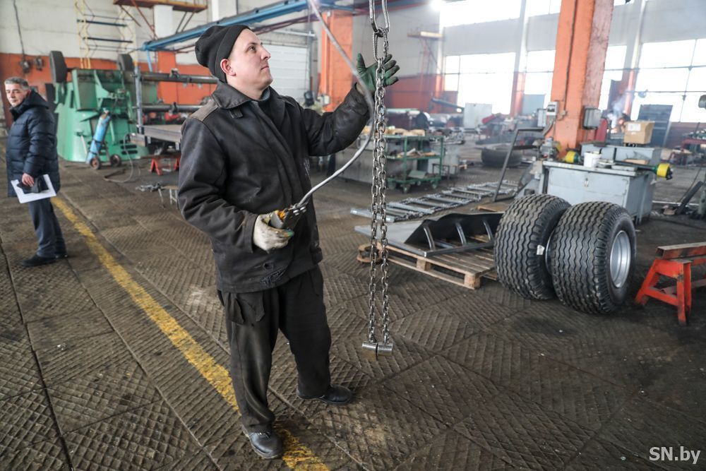 Мы увидели процесс производства кормораздатчика «Кормилец». Конкретно этот – одноосный прицеп для повышенной маневренности. В раздатчик для дальней транспортировки устанавливается балансирная тележка, которая существенно снижает угловые колебания, тем самым увеличивая долговечность и срок службы изделия. Ежегодно такой продукции продается в Российскую Федерацию на сто тысяч долларов в год. Это собственная разработка ОАО «Светлогорский агросервис» – сертифицированная продукция, которая востребована не только в Республике Беларусь, но и Российской Федерации.