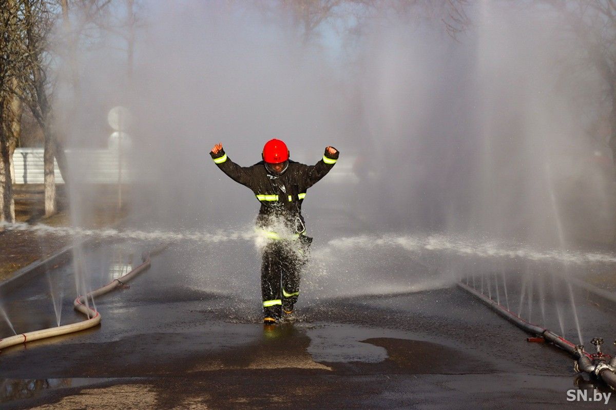 Согласно всем канонам, под бурные аплодисменты присутствующие провели Александра Пашкелевича на заслуженный отдых по специфической традиции спасателей: под звуки пожарных сирен Александр прошел сквозь водяную завесу.