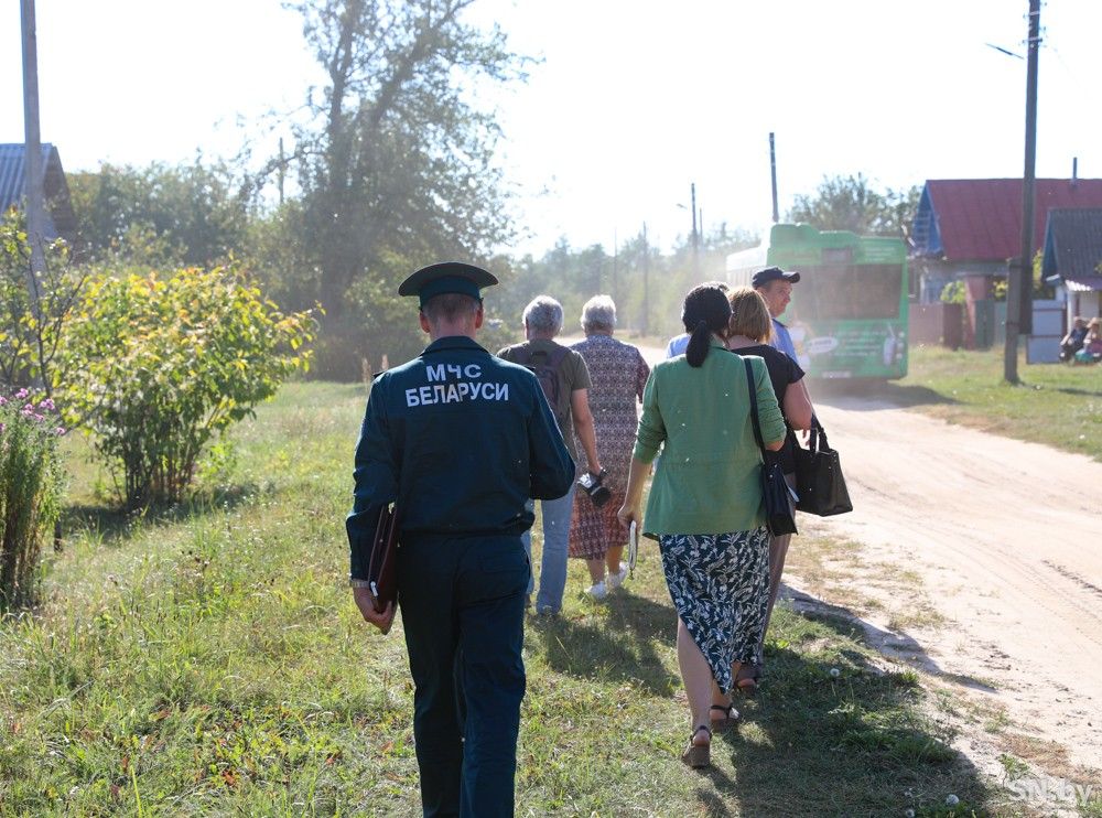Члены эвакуационной комиссии Светлогорского райисполкома в сопровождении председателя Паричского сельисполкома Александра Цалко начинают движение с первой хаты по улице Октябрьской. Стучат в ворота, объясняют появившимся хозяевам ситуацию, узнают, нужна ли медицинская помощь, предлагают собрать документы, вещи, запас продуктов, запереть домохозяйство и отправиться в автобус. По списку в Кастрычнике проживают 37 человек, но по факту количество может быть другим. Ведь кто-то на работе, кто-то уехал в гости и так далее.
