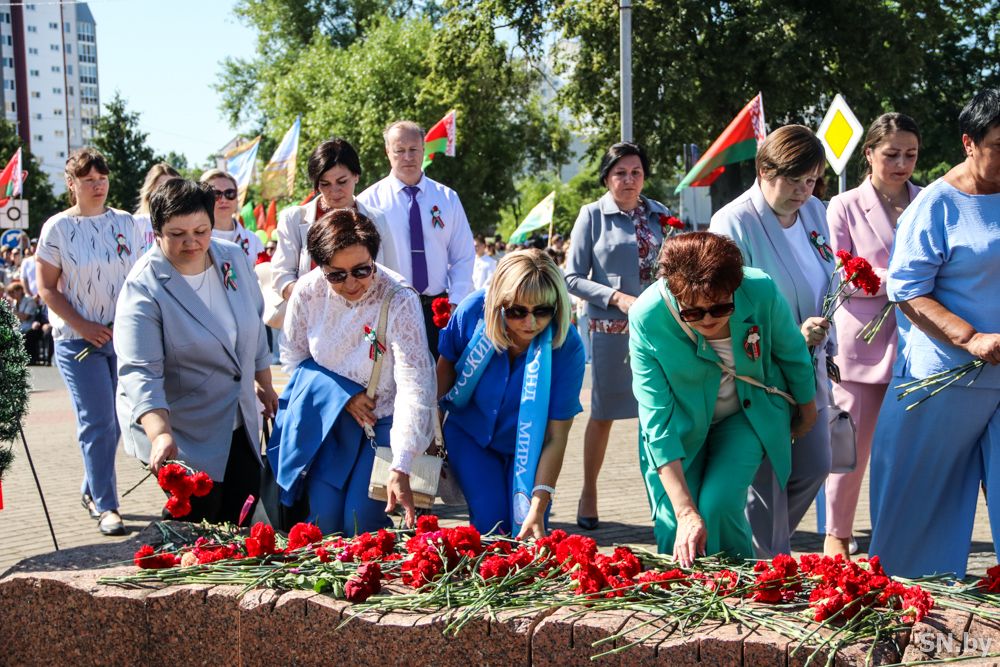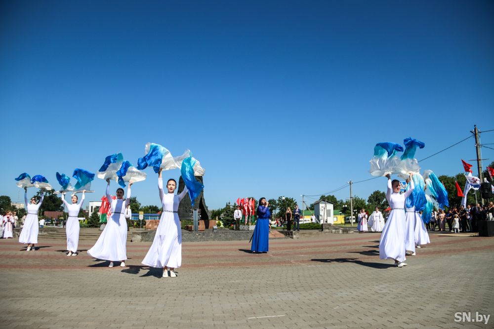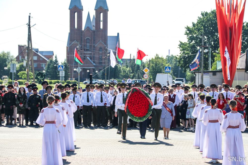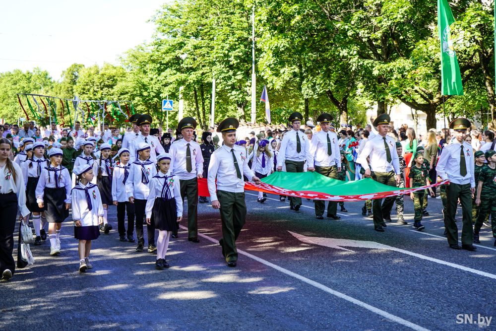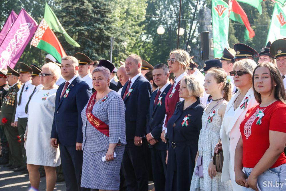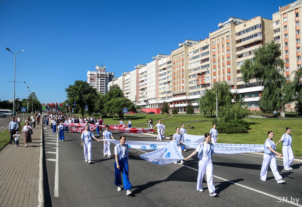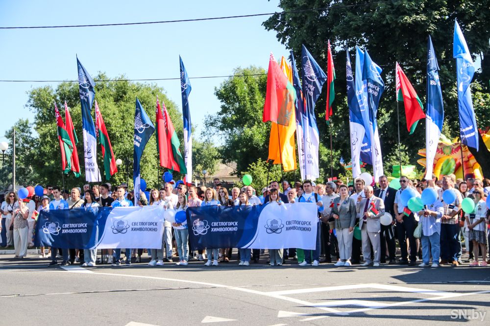 Мероприятия главного праздника страны в Светлогорске начались с традиционного праздничного шествия администрации Светлогорского района и почетных граждан, трудовых коллективов и общественных организаций. По центральной улице к монументу «Скорбящий колокол» прошагала и молодежь: особенную колонну видно издалека – светлогорцы приняли участие в районной акции «Пад сцягам з вышыванкай».
