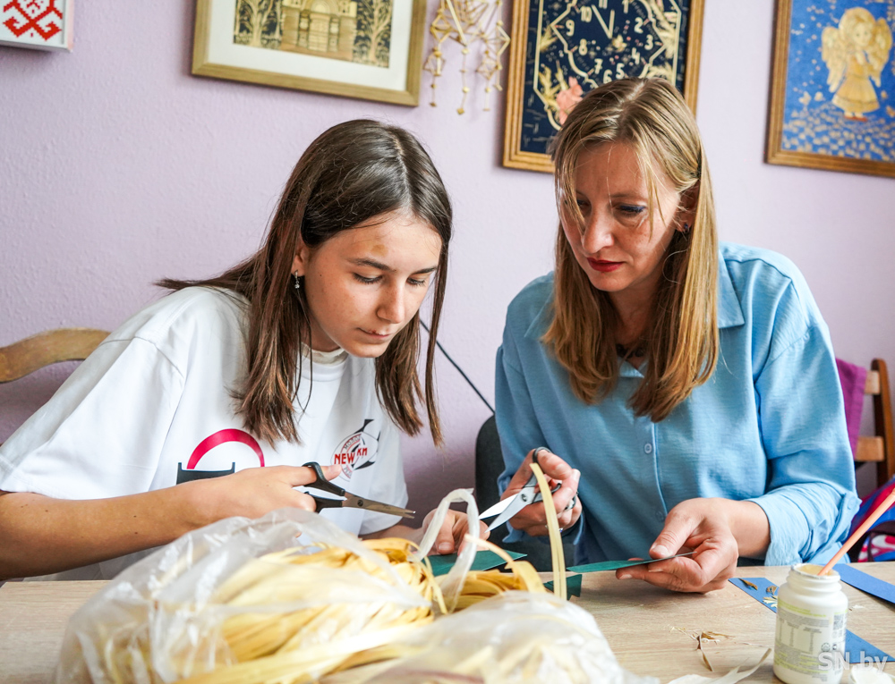 Милана Енич чуть раньше призналась, что в ее семье любят рукоделие, поэтому ей вдвойне интересно пообщаться с мастерами: «У меня появилась возможность посетить Дом ремесел – и это прекрасно! Было сложно определиться, чем именно хотелось заняться на мастер-классе, ведь у меня любая ручная работа вызывает большой интерес. С малого возраста я вяжу, шью, рисую, делаю различные оригами, недавно стала осваивать вышивку крестом. Возможно, мне передалась эта предрасположенность от семьи: мама с детства вяжет, красиво рисует, много сделала изделий из соломы; бабушка тоже очень хорошо вяжет, рисование – ее страсть; прабабушка еще при жизни вязала шали со сложным узором. Так вот, я решила попробовать работу с соломой. Светлана предложила сделать закладку для книги, обклеив ее обработанной соломой. Мне захотелось изобразить на своем изделии символ Беларуси – василек. Работа очень кропотливая: детали крохотные, поэтому все руки были в клее. Светлана очень любит свое дело. Она понятно объясняла, предлагала несколько вариантов действий во время процесса. Я чувствовала спокойствие и комфорт, ведь занятия такого рода помогают освежить голову и расслабиться, получить вдохновение для новых проектов. Благодаря хорошему учителю у меня вышла чудесная маленькая закладка! Теперь я хочу еще больше освоить плетение из соломы».