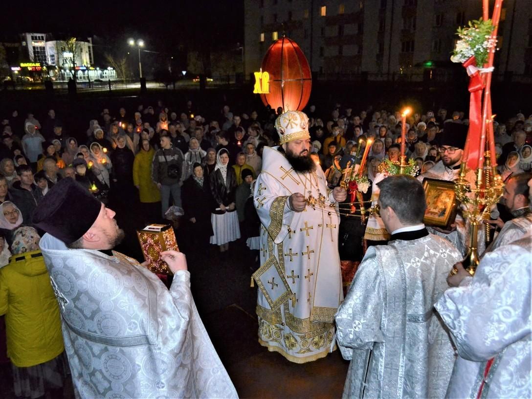 По окончании Божественной литургии владыка Амвросий огласил Пасхальное послание Святейшего Патриарха Московского и всея Руси Кирилла, сердечно поздравил всех молящихся со Светлым праздником Святой Пасхи, причастников с принятием Святых Христовых Таин и преподал молящимся архипастырское благословение. По завершении богослужения архипастырь пригласил всех присутствующих в храм Преображения Господня в г. Светлогорске на соборное архиерейское богослужение, посвященное празднованию 1030-летия Православия на белорусских землях; затем совершил освящение пасхальных куличей и праздничной снеди.