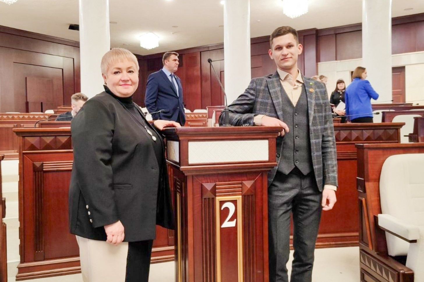 Павел: «Лаптева Елена Евгеньевна показала мне свой рабочий кабинет и рабочее место в парламенте, провела небольшую ознакомительную экскурсию по парламенту. Что касается совместного с депутатом Палаты представителей сотрудничества, хочу сказать, что я уже присоединился к работе Елены Евгеньевны в округе: вместе провели личный прием граждан в рп.Сосновый Бор, пообщались с председателем Сосновоборского сельисполкома о предстоящих выборах, посетили местный дом культуры и несколько торговых объектов с целью мониторинга цен».