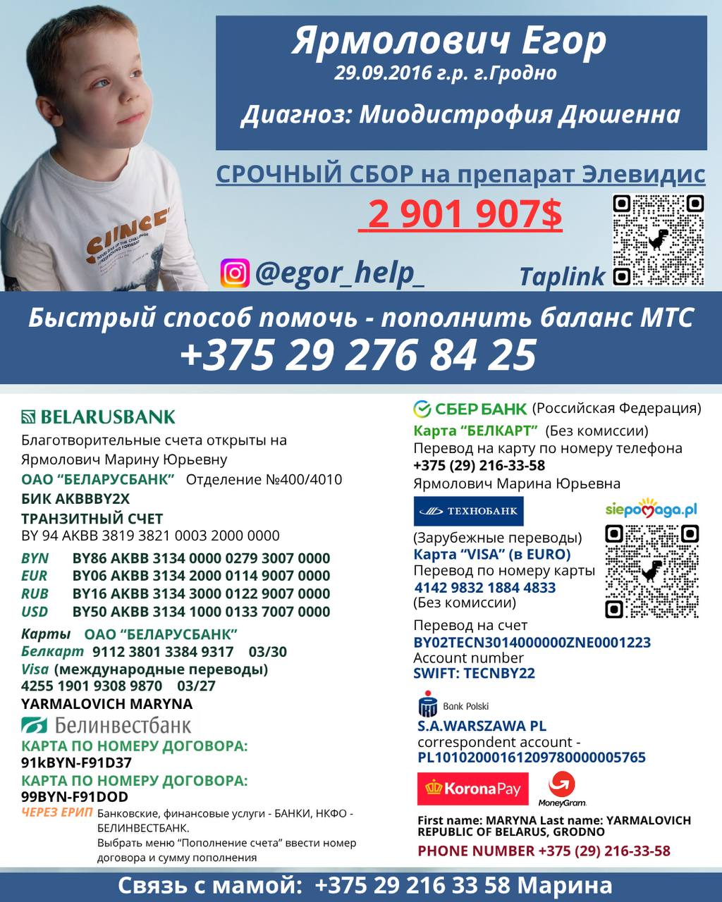 Я, Ярмолович Марина Юрьевна, прошу Вас о помощи для моего сына, Ярмоловича Егора Сергеевича (29.09.2016 гр.). У него диагностировано тяжёлое генетическое заболевание Миодистрофия Дюшенна, приводящее к атрофии мышц. Дети с таким заболеванием к 10-12 годам лишаются возможности передвигаться самостоятельно, у них возникают осложнения с сердечно-сосудистой и легочной системами. В качестве лечения применяется один из самых дорогих препаратов в мире Elevidys, стоимость которого очень высока - 2 901 907 долларов США. Я воспитываю сына одна, такая сумма для нашей семьи не подъёмная