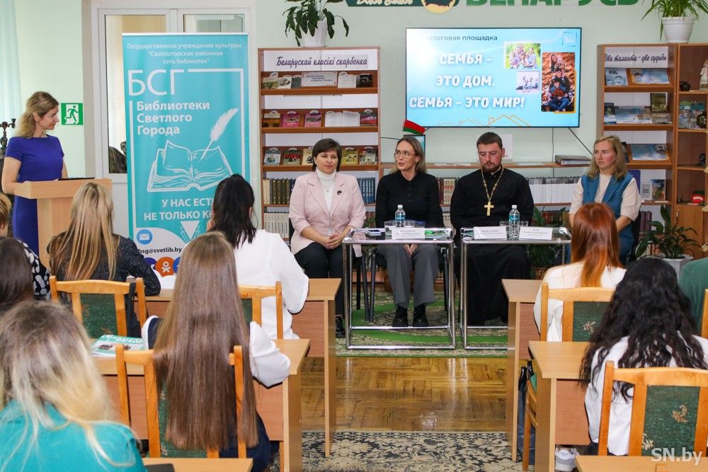 Секретами семейного счастья с молодежной аудиторией делились начальник отдела ЗАГС Светлогорского райисполкома Наталья Ничипоренко, иерей Алексей, методист районного учебно-методического кабинета Альбина Кохно и многодетная мама Елена Чугай.