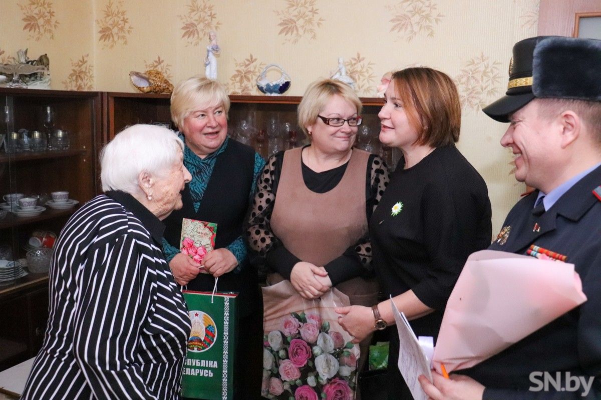 Со знаменательной датой ее пришли поздравить военный комиссар Светлогорского и Октябрьского районов Андрей Рынейский, директор ТЦСОН Елена Кацуба, председатель районной организации Белорусского общественного объединения ветеранов Елена Кукар, председатель районной организации Белорусский фонд мира Елена Шишкова и председатель общественного объединения «Белая Русь» Виктория Бусел, начальник отдела по гражданству и миграции Светлогорского РОВД Сергей Курганский.