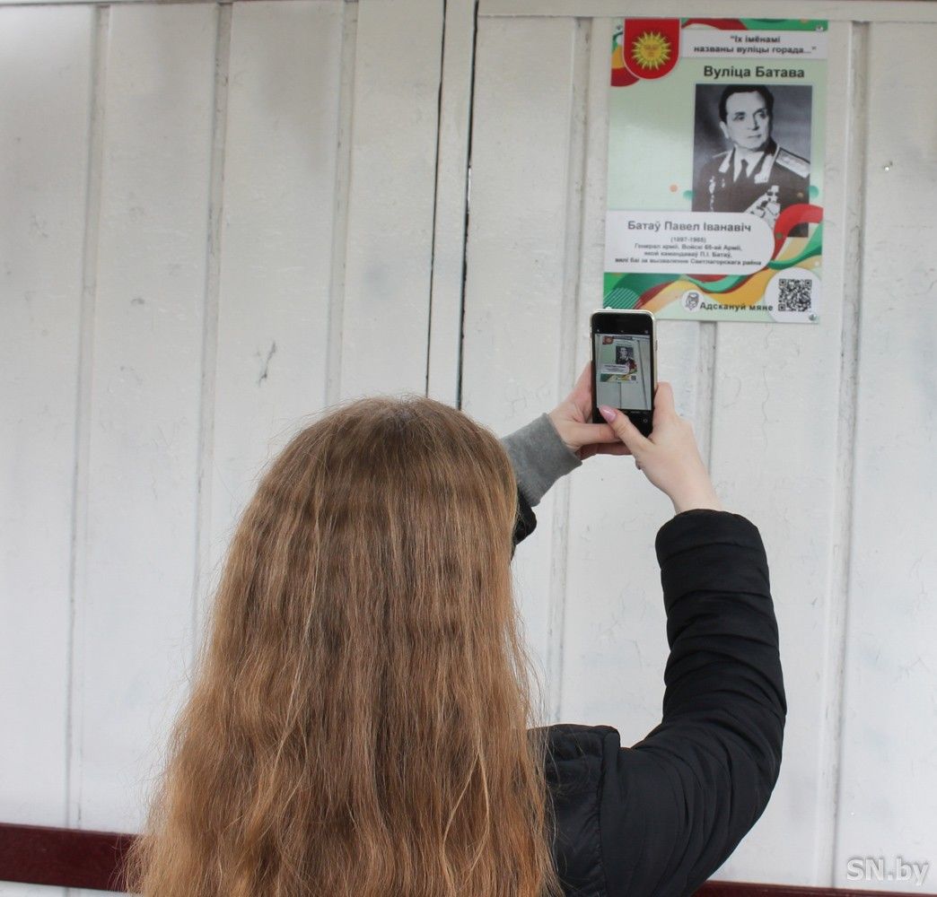 Ребята из средней школы №10 г.Светлогорска провели большую подготовительную работу. По их подсчетам, в городе 48 улиц, названных в честь тех, кто своим подвигом и трудом заслужил это право. Школьники отыскали информацию, исторические справки по каждому из них. Изучили материал и систематизировали, создали электронный сборник с презентацией улиц города Светлогорска. Визуализировали, разместив на остановочных пунктах общественного транспорта таблички с фотографиями и именами людей и QR-кодами, через которые можно получить информацию из электронного сборника. Автобусные остановки были выбраны не случайно, ведь именно здесь собирается много людей, которые спешат на работу, дети – в школу. Каждый из них во время ожидания транспорта может узнать много нового и интересного о людях, в чью честь названа улица, на которой они сейчас находятся.