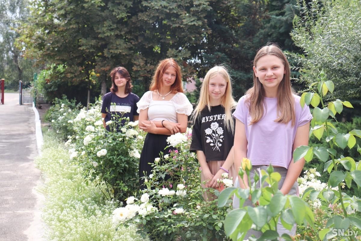 Педагог Боровиковской школы Александр Плешкунов радушно встречает меня в благоухающем цветами школьном дворе и знакомит с активными участницами проекта «Школьный сад» — именно Вероника, Алина, Ангелина и Анна ездили под Смолевичи.