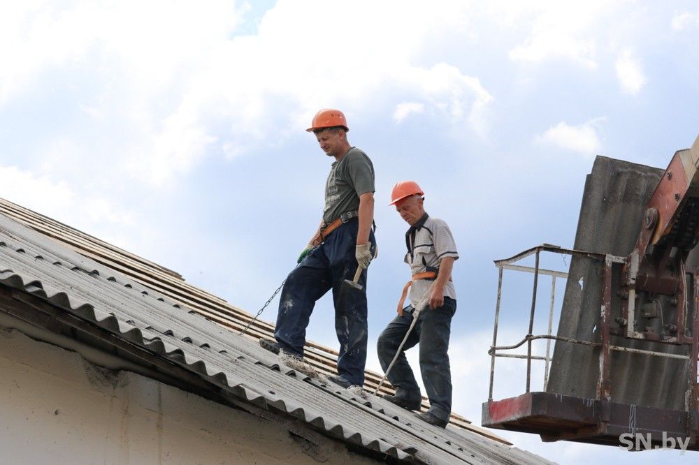 Чтобы дожди не испортили зерно, проводится ремонт кровли. На помощь сельчанам пришли промышленники со своей специальной техникой. На ремонтных работах занята бригада ОАО «Строительный трест №20». Работу проводят оперативно и с соблюдением правил безопасности.
