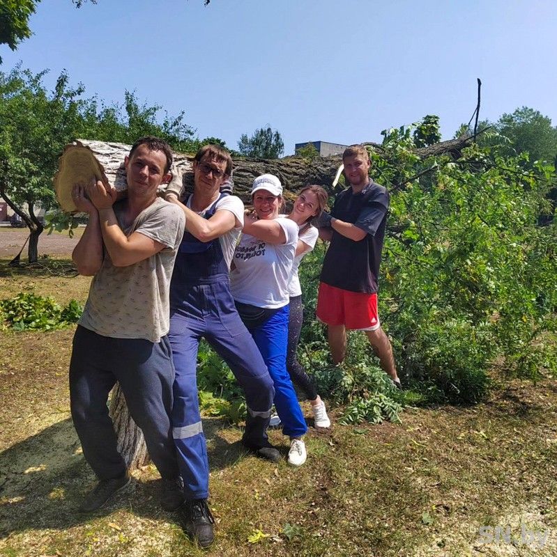 От «Светлогорского ЦКК» прибыло несколько добровольцев с бензопилами, предприятие выделило транспорт для отвозки порубленных остатков деревьев. К ним присоединились работники гимназии, учащиеся Светлогорского индустриального колледжа – бывшие выпускники гимназии, активные участники молодежного движения, и, конечно же, активисты профсоюзов. Как отметила председатель первичной профсоюзной организации ОАО «Светлогорский ЦКК» Наталья Метлушко, у многих работников дети учатся в этом учреждении образования, а потому неприятности, нахлынувшие на гимназию вследствие грозы, они восприняли как свою личную боль: