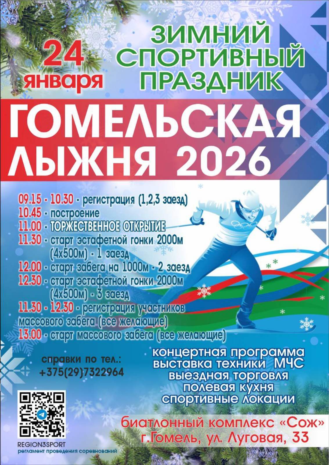 В программе предусмотрены эстафетные лыжные гонки, массовый забег. Возраст участников в зависимости от видов программы — от 18 до 60 лет и старше, то есть все, кто любит зимние виды спорта и имеет надлежащее состояние здоровья (это надо подтвердить медицинской справкой), могут стать участниками.