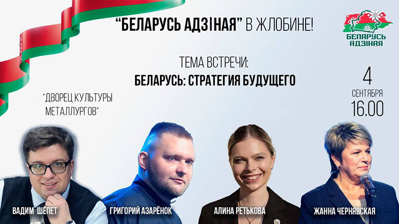 Сегодня в Жлобине проходит областной этап республиканской информационно-просветительской акции «Беларусь адзіная». Ее спикерами являются телеведущий и пропагандист Григорий Азарёнок, председатель Молодёжного парламента при Национальном собрании Республики Беларусь Алина Ретькова, депутат Палаты Представителей Национального собрания Республики Беларусь Жанна Чернявская, а также теле- и радиоведущий Вадим Шепет. Тема диалога – «Беларусь: стратегия будущего». Участники постараются ответить на важные для белорусского общества вопросы: каков образ будущего, как мы видим Беларусь, какие цели стоят в ходе пятилетки качества?