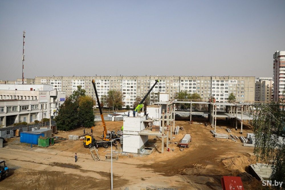 И вот этот момент настал. Проектные работы осуществило проектно-изыскательское унитарное предприятие «Институт Полесьпроект». Старое здание кинотеатра было демонтировано, устроены новые фундаменты. На сегодняшний день полностью готовы подвальные помещения и подземные коммуникации будущего торгово-развлекательного комплекса, смонтированы два этажа каркаса из сборного железобетона. Особенностью строительства является сборно-монолитная каркасная технология. Готовые железобетонные изделия были произведены на заводе, доставлены на стройплощадку, установлены в проектное положение. Затем монтажные узлы замонолитили бетоном. Таким образом были построены два этажа несущего каркаса с перекрытиями.