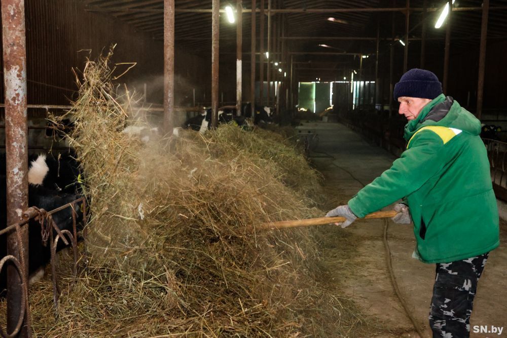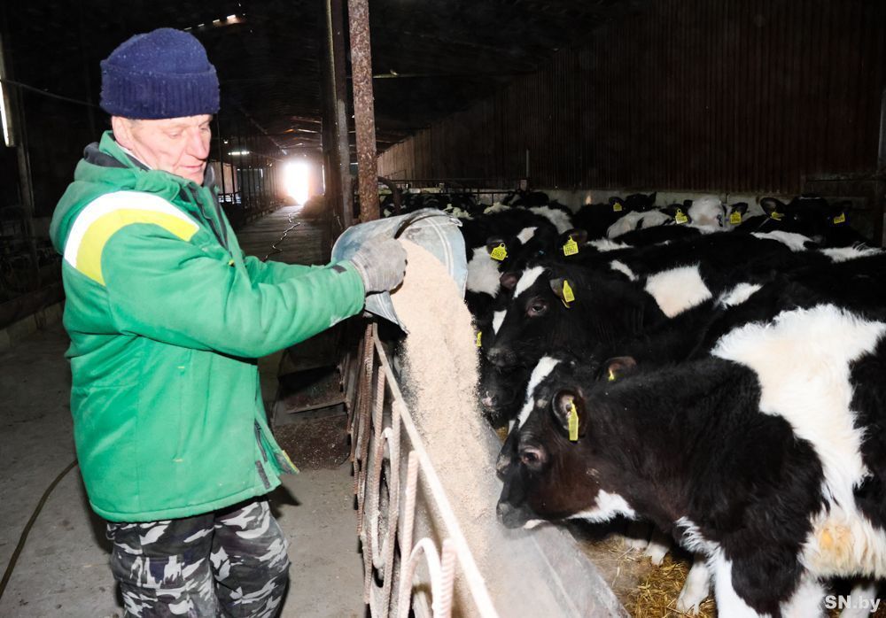 В одном из сараев находятся телята с одного и до пяти месяцев. Здесь содержится 230 животных. Они разделены по возрастным группам, что позволяет рационально, качественно и в соответствии с технологическими условиями осуществлять за ними уход и кормление. Животновод Антон Синицкий работает на этом участке третий год. На его памяти здесь с такими суровыми зимними условиями сталкиваться еще не приходилось. А потому меры, принятые для утепления помещений, считает правильными, своевременными и удобными для телят. Главным условием, по словам опытного животновода, является своевременная замена соломенной подстилки на сухую и свежую, а также полноценный рацион кормления. Как рассказал директор сельхозпредприятия, с целью восполнения энергии у животных в холодный период рацион животных был пропорционально увеличен: «При выпойке мы стали давать телятам больше молока, молодняку постарше и коровам увеличили порцию комбикорма. Все вместе, на наш взгляд, помогает сохранять здоровье животных, а также практически без производственных потерь обеспечивать работу комплекса. Что касается объемов кормов, в хозяйстве нехватки нет. Запасов хватит, чтобы спокойно пройти текущий осенне-зимний стойловый период».