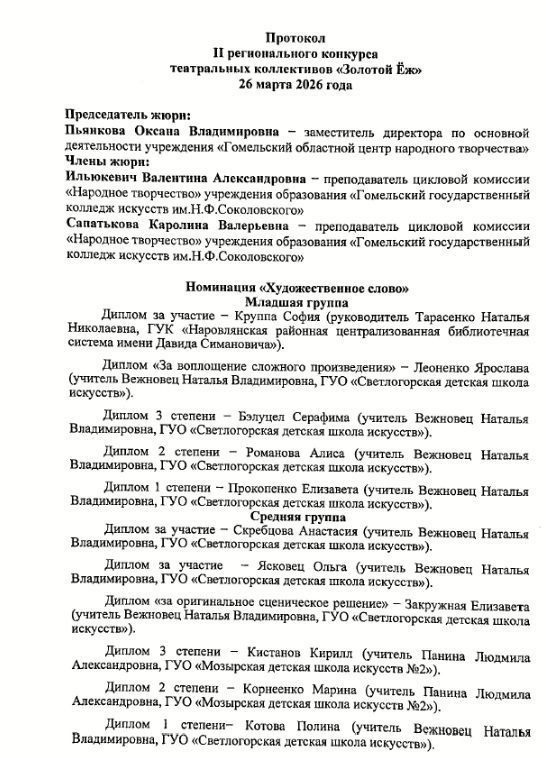 В Светлогорской детской школе искусств прошел II региональный конкурс детских театральных коллективов «Золотой ёж». В номинациях «Художественное слово», «Оригинальный жанр», «Театр» выступили воспитанники художественных коллективов учреждений образования и культуры Гомеля, Светлогорска, Мозыря, Жлобина, Наровли, Любани. Участников конкурса приветствовала председатель жюри – заместитель директора учреждения «Гомельский областной центр народного творчества» Оксана Владимировна Пьянкова. Она поздравила участников конкурса и зрителей с наступающим праздником – Всемирным днем театра и пожелала всем хорошего настроения и позитивных эмоций.