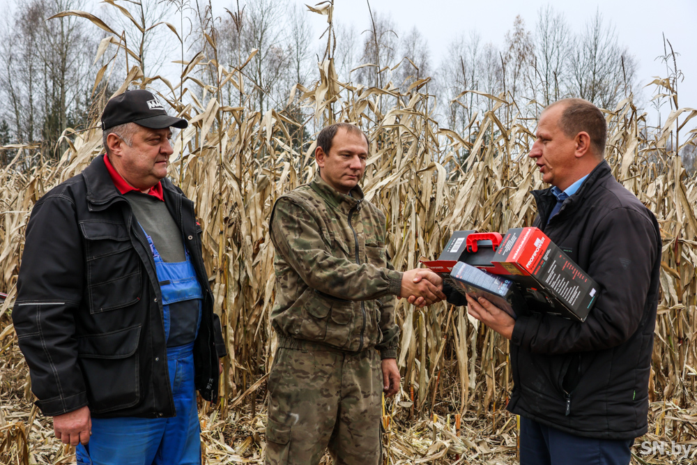 В завершение уборки кукурузы на зерно директор КСУП «БОРОВИКИ» Вадим Запотылок приехал в поле, чтобы поздравить комбайнера Петра Запотылка и водителя на отвозке Виталия Стукача с высокими достижениями: