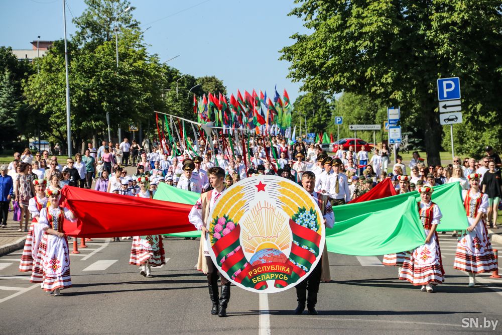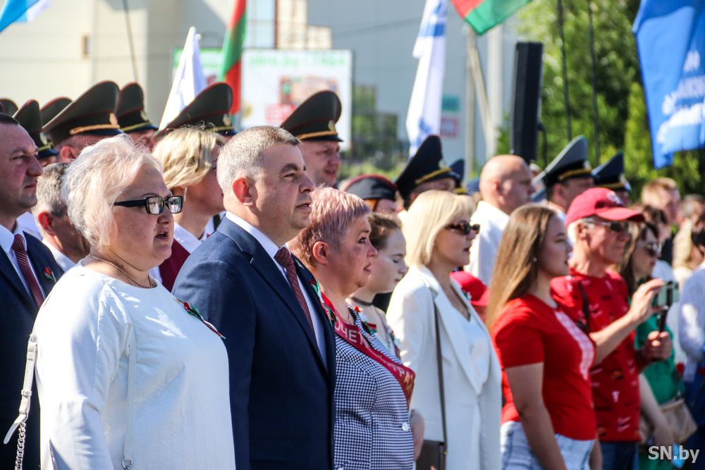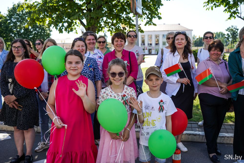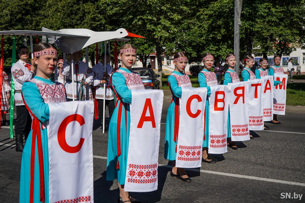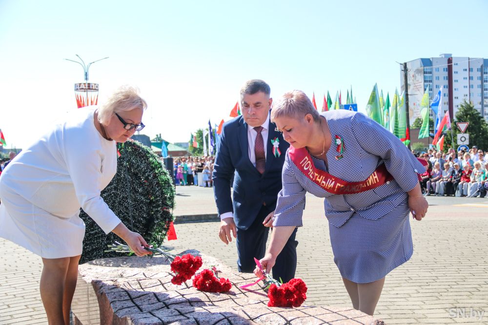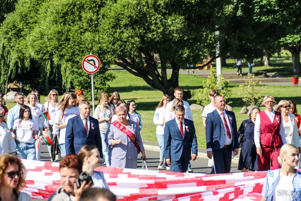 Мероприятия главного праздника страны в Светлогорске начались с традиционного праздничного шествия администрации Светлогорского района и почетных граждан, трудовых коллективов и общественных организаций. По центральной улице к монументу «Скорбящий колокол» прошагала и молодежь: особенную колонну видно издалека – светлогорцы приняли участие в районной акции «Пад сцягам з вышыванкай».