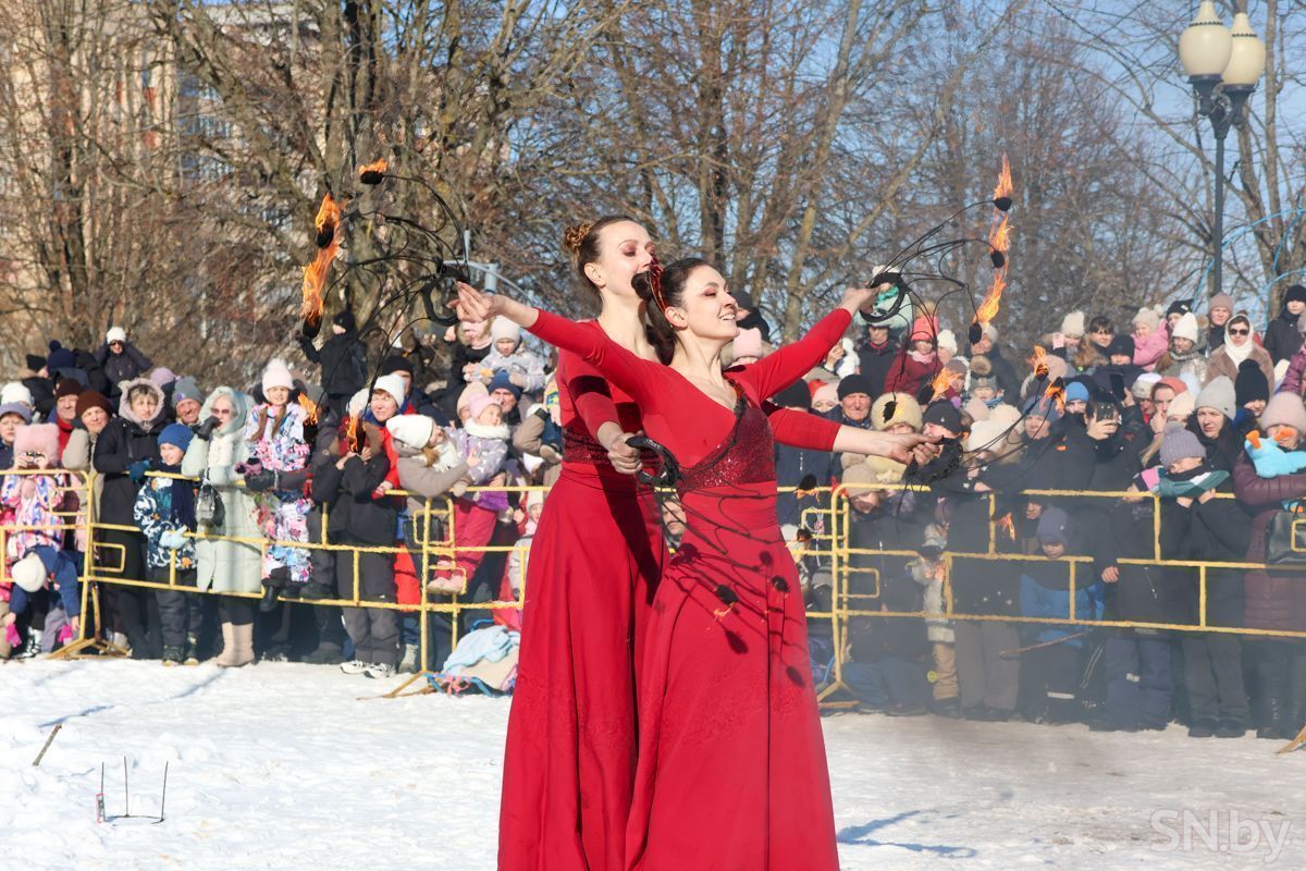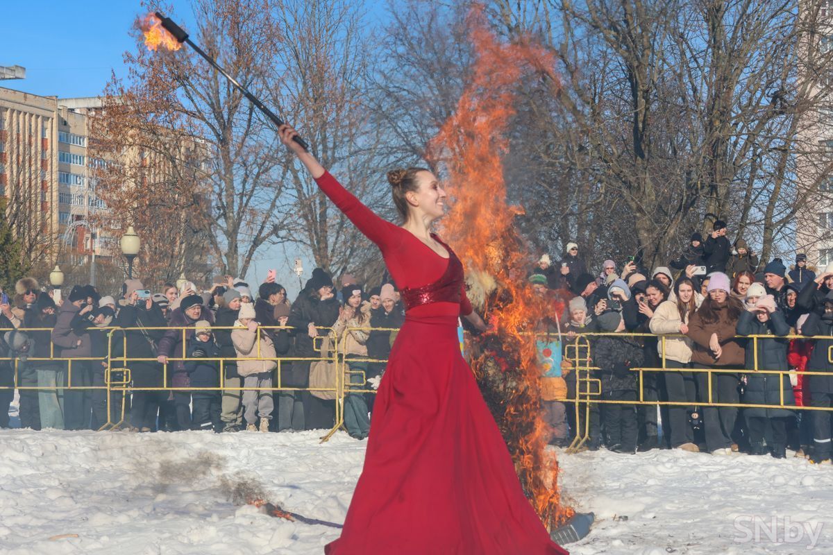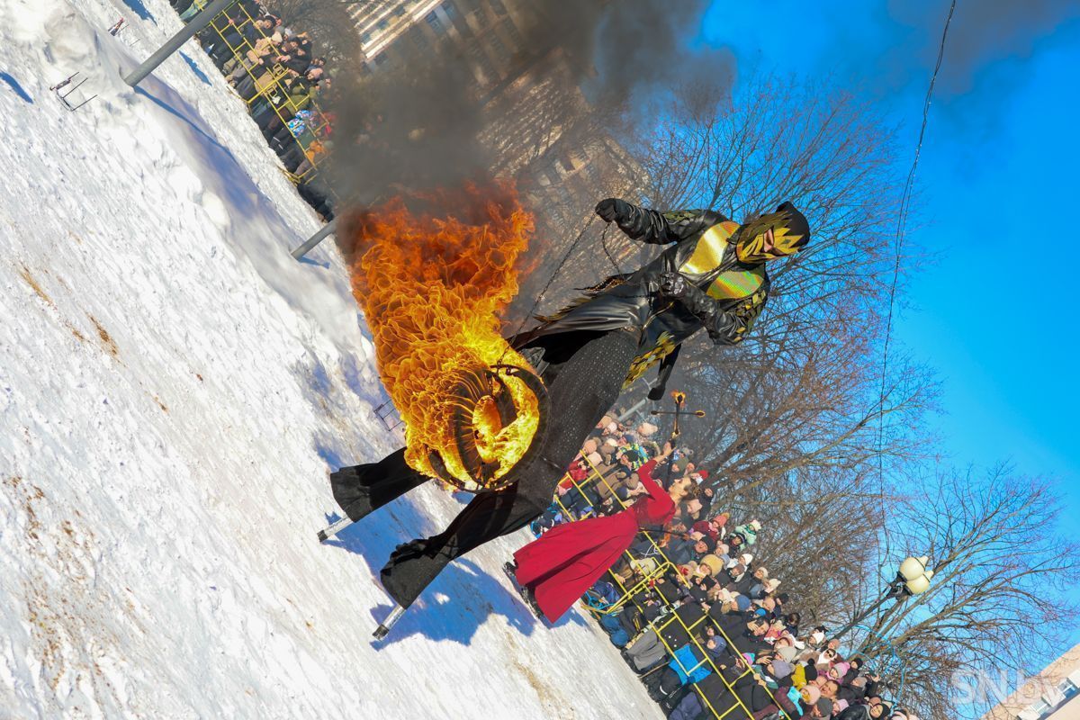 Кульминацией праздника Масленица стала традиция сжигания чучела зимы. Нарядную, но все-таки уже засидевшуюся в гостях зиму заставили вспыхнуть ярким пламенем гости из столицы, представившие зрителям красочное огненное шоу.