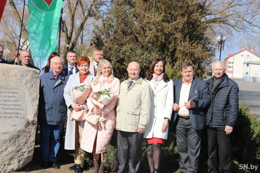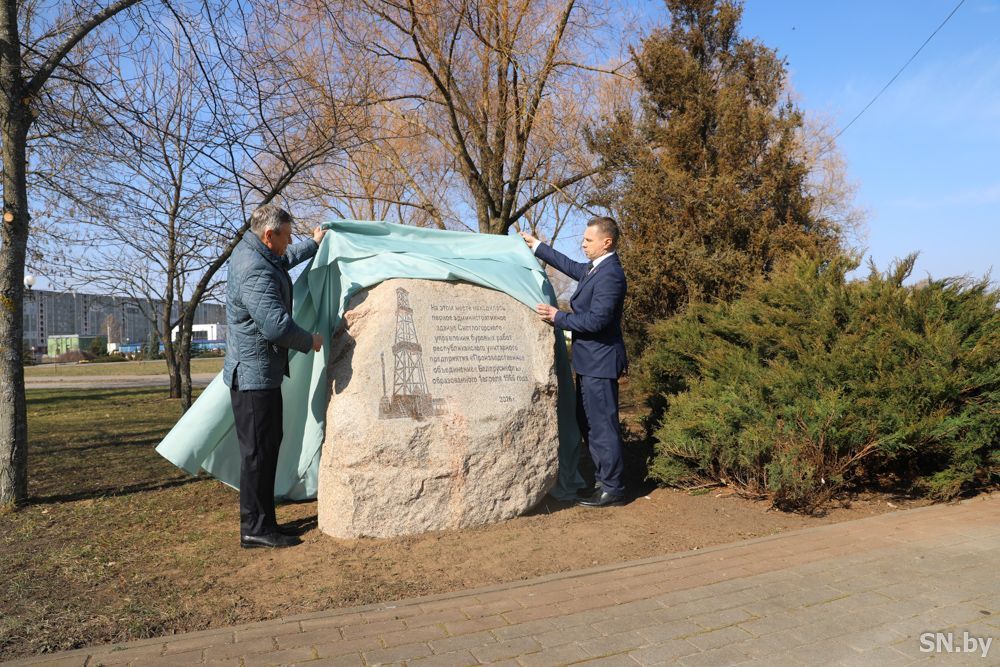 И вот исторический момент – полог с памятного знака снимают первый заместитель председателя Светлогорского райисполкома Александр Магазинщиков и начальник СУБР Сергей Кравченко. Присутствующие на церемонии ветераны одобрительно улыбаются. К микрофону подходят два ветерана производства. Это Валерий Александрович Водопьянов, который отработал в СУБР более 38 лет – с июля 1971 года по январь 2010 года, увольнялся на пенсию с должности начальника управления. Вместе с ним Юрий Александрович Большаков, который был принят на работу в управление в сентябре 1968 года, ушел на пенсию с должности начальника управления в 2014 году. Мужчины поделились воспоминаниями, связанными со становлением и дальнейшим развитием СУБР. Когда в Белоруссии обнаружили промышленные запасы нефти, сюда съехались специалисты со всего Советского Союза. Приехали на голое место. Для организации административного здания конторы, производственных цехов – токарного, слесарного, турбинного, транспортного, а также лаборатории глинистых растворов, вышкомонтажного управления вместе с руководством города было принято решение использовать как помещения бывшей судоверфи, так и строить новые. Со временем прошла специализация, разделение и управление переместилось на территорию современной базы производственного обслуживания по Промысловому переулку. Но начиналось все именно отсюда. И одна из серьезных заслуг светлогорских нефтяников заключается в том, что на территории Светлогорского района – в месте, где были одни сплошные болота – они создали сеть автомобильных дорог.