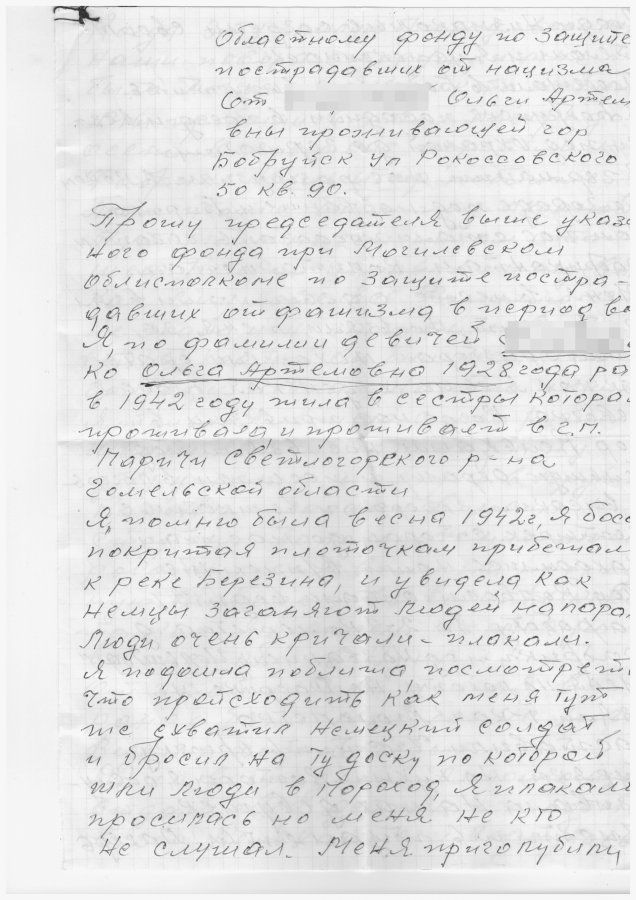 Ольга О. (1928 г.р.) в 1942 году жила с сестрой в г.п.Паричи (стилистика автора сохранена): «Я помню, была весна 1942 года. Я босиком, покрытая платочком, прибежала к реке Березина и увидела, как немцы загоняют людей на пароход. Люди очень кричали, плакали. Подошла поближе, посмотреть, что происходит, как меня тут же схватил немецкий солдат и бросил на ту доску, по которой шли люди в пароход. Я плакала, просилась, но меня никто не слушал. Меня приголубили, люди незнакомые согрели, и я успокоилась.